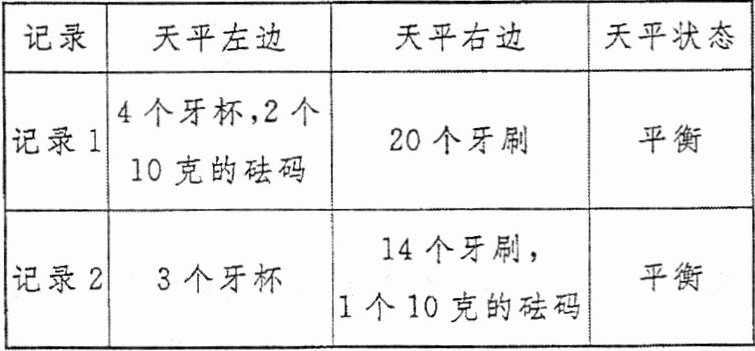 个牙刷和 $5$ 个 $10$ 克的砝码可使天平平衡.
