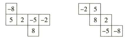 12. 北师大附属实验校本经典题 如图,这是一个正方体纸盒的两个表面展开图,请把 -8,5,8,-2,-5,2 分别填入六个正方形中,使得折成正方体后,相对面上的两数互为相反数.