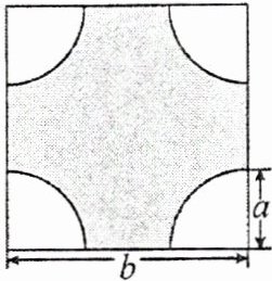 13. 湖南师大附中校本经典题 如图,在一个边长为 $ b \mathrm { cm } $ 的正方形的四角各剪去一个半径为 $ a \mathrm { cm } $($ a $ 不超过 $ \frac { b } { 2 } $)的 $ \frac { 1 } { 4 } $ 圆。请用代数式表示阴影部分的面积,并求当 $ a = 2 $,$ b = 6 $ 时阴影部分的面积(结果保留 $ \pi $)。