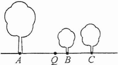 9. 如图,$ A $,$ B $,$ C $ 三棵树在同一条直线上,小明正好站在线段 $ AC $ 的中点 $ Q $ 处,$ BC = 2BQ $.
