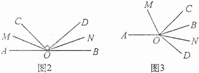 (2) 如图 2,直角 $ ∠COD $ 与平角 $ ∠AOB $ 按如图所示的方式摆放在一起,且 OM 和 ON 分别是 $ ∠AOC $,$ ∠BOD $ 的平分线,求 $ ∠MON $ 的度数。