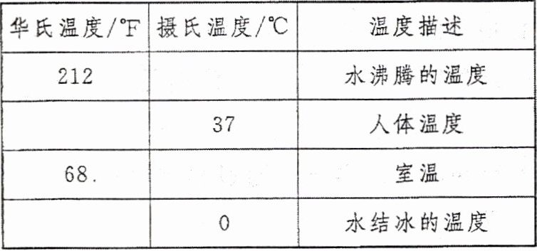 15. 有的温度计有华氏、摄氏两种温标,华氏温度 $F(^{\circ}F)$、摄氏温度 $C(^{\circ}C)$ 温标的转换公式是 $F = 1.8C + 32$,请填写下表.