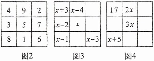 。(2) 设图3所示的三阶幻方中间的数为 $x$($x$ 为整数),请用含 $x$ 的代数式将图3幻方补充完整。