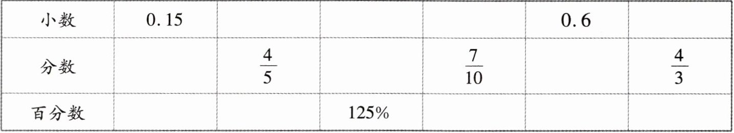小数:0.8 1.25 0.7 1.33 分数:$\frac{3}{20}$ $\frac{5}{4}$ $\frac{3}{5}$ 百分数:15% 80% 70% 60% 133%