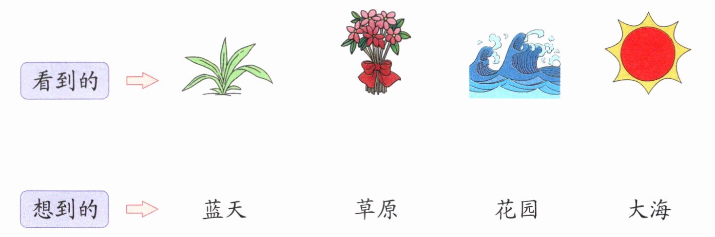 3. 儿歌中的“我”看到小草、鲜花、浪花、阳光后,分别想到了什么?连一连。