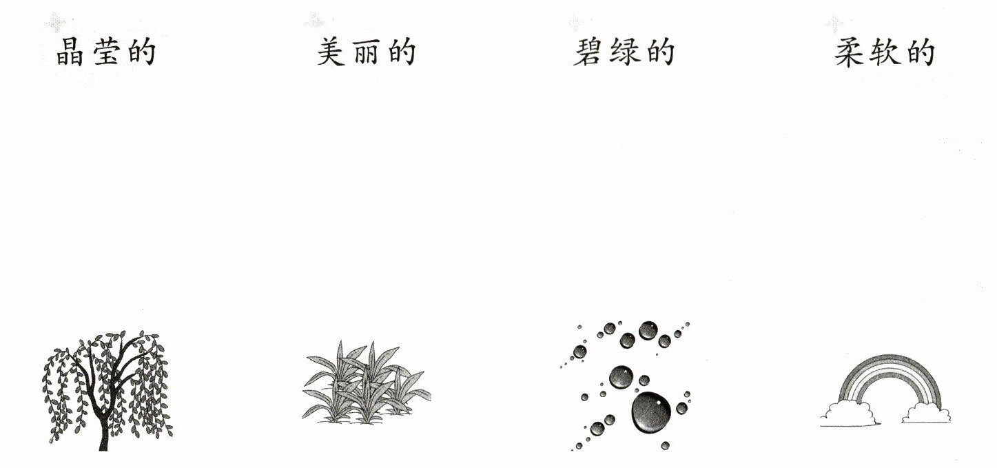 1. 钻 爬 趴 2. 柳枝(或:柳树) 小草 青蛙 蚂蚁 3. ![img alt=3] 4. 荷叶上滚动着的晶莹的水珠,真像一粒粒亮晶晶的珍珠。5. 劲头十足、精神振奋 解析:联系下文中的“使劲儿歌唱”可知,青蛙“唱歌”的劲头很足,十分有精神。据此可以推测“精神抖擞”是形容青蛙劲头十足、精神振奋的样子。6. 示例一:天空清澈透明,像是被洗过一样 示例二:田里的禾苗喝足了雨水,显得格外翠绿
