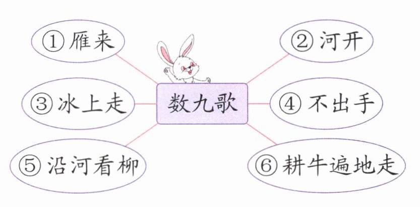 ④ ③ ⑤ ② ① ⑥ 读了这首民谣,我知道:三九四九时天气很冷,河面结着冰;七九时冰开始融化;八九时大雁飞回北方。