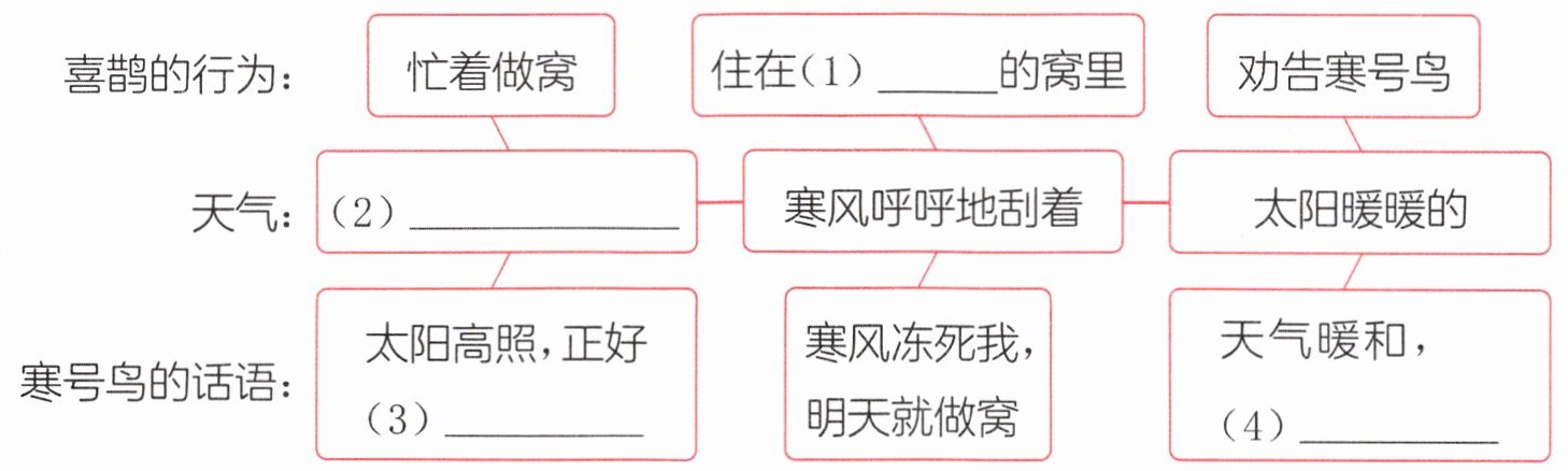 喜鹊的行为: 忙着做窝 住在(1)______的窝里 劝告寒号鸟