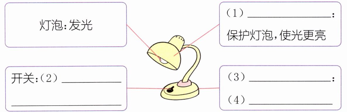 2.(思维导图)“完美的台灯”是由哪几部分组成的?各个部分又有什么作用?请结合文章内容,完成下面的思维导图。