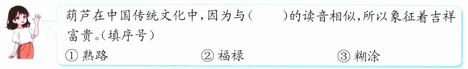葫芦在中国传统文化中,因为与( )的读音相似,所以象征着吉祥富贵。(填序号)① 熟路 ② 福禄 ③ 糊涂