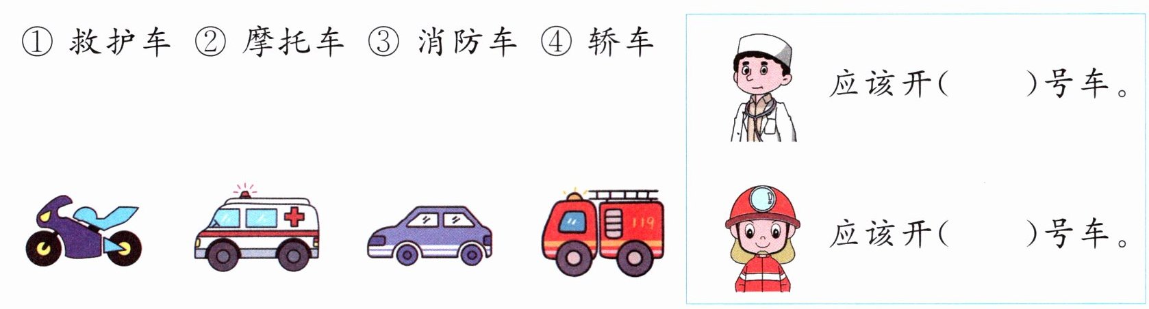 ① 救护车 ② 摩托车 ③ 消防车 ④ 轿车