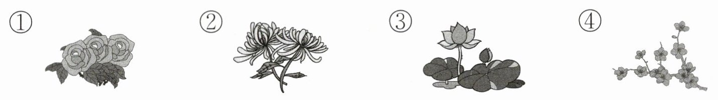① ③ ② ④ 解析:牡丹通常在四月开放,花朵硕大、色泽艳丽,被誉为“国色天香”,是富贵与美好的象征;荷花于六月进入盛花期,生长在水中,花茎挺直,花朵优雅;菊花多在秋季开放,尤其九月,品种繁多、花色丰富,“绚丽多彩”能很好体现其特点;梅花不畏严寒,在腊月的冰天雪地中傲然绽放,以坚韧的品格闻名。