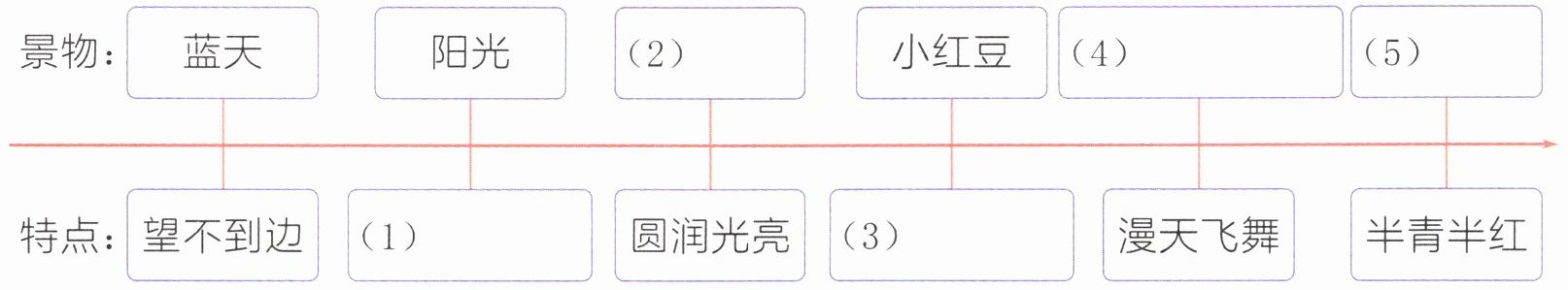 1.(1)透亮澄澈(或:明亮如金)(2)山楂(3)晶莹饱满(4)蒲公英种子(5)秋枣 2. 枝条长得稀疏,不茂密 清晰明显,引人注目 3. 拟人 颜色 排列紧密 又多又饱满 对小红豆的喜爱