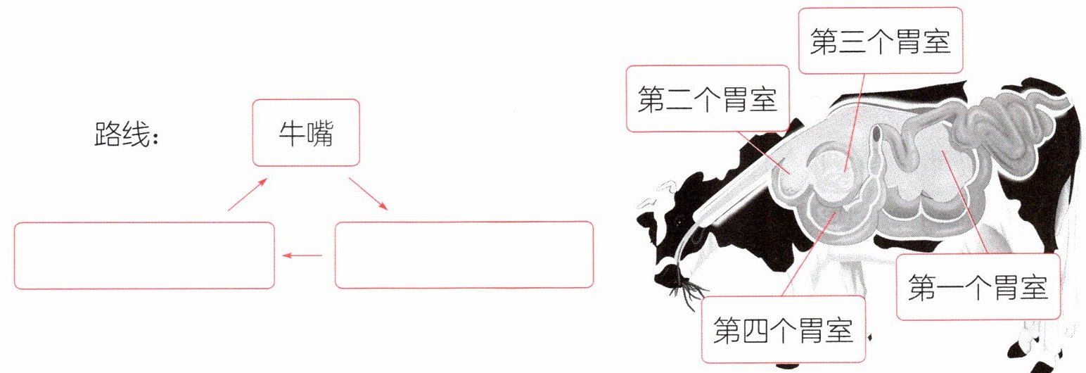 五、红头在牛肚子里进行了一段奇妙的旅行,请你根据课文内容补充红头的旅行路线图。