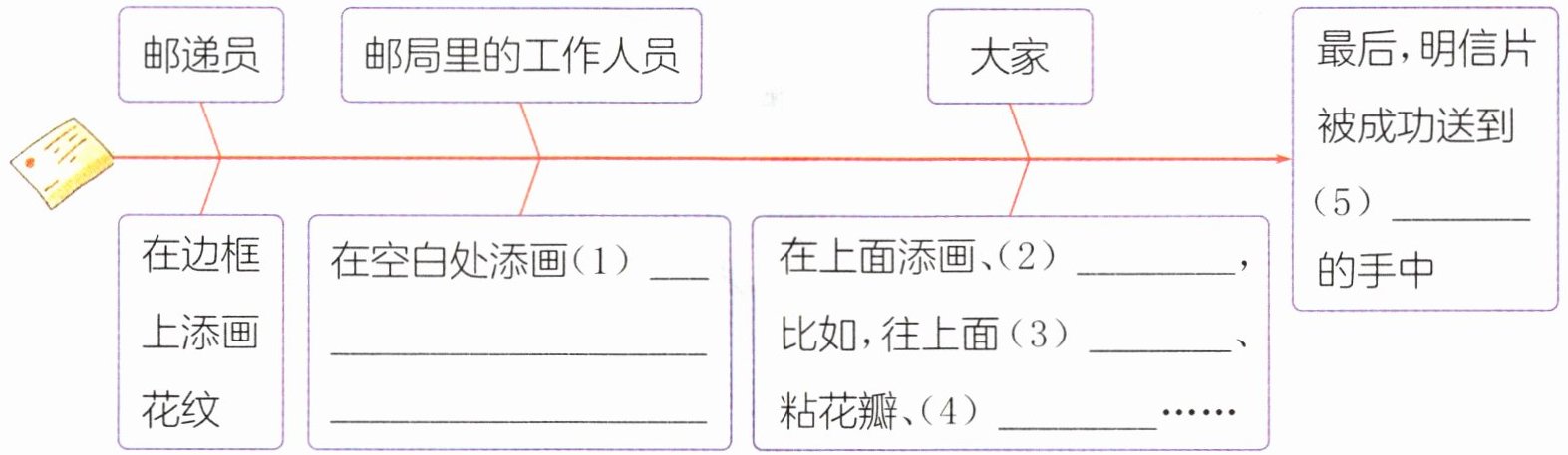 1.(1)几片树叶和一朵鲜花 (2)装饰 (3)扎丝带 (4)洒香水 (5)青蛙 (6)蛤蟆的真诚 2.(2)√ (3)√ 3. 示例:想不到你每年都给我寄明信片,我好感动啊!唉,我都很久没有回去看你了,也忘了给你回信,对不起,希望你能原谅我。今年我一定回去,和你一起过个年。 4. 示例:我认为蛤蟆的明信片并不普通。蛤蟆虽穷,但依然坚持每年都给青蛙寄明信片,而且明信片上写了对青蛙的思念和关心,还告诉青蛙快过年了要吃得好一点儿,这样真挚的情感让人感动。