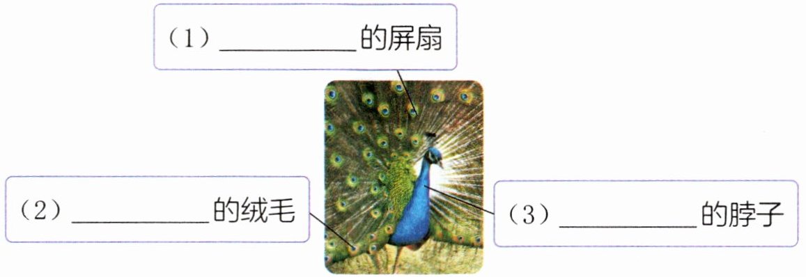 1.(阅读要素)文章描写了小孔雀的外形特点,请用有新鲜感的词语填写下图。