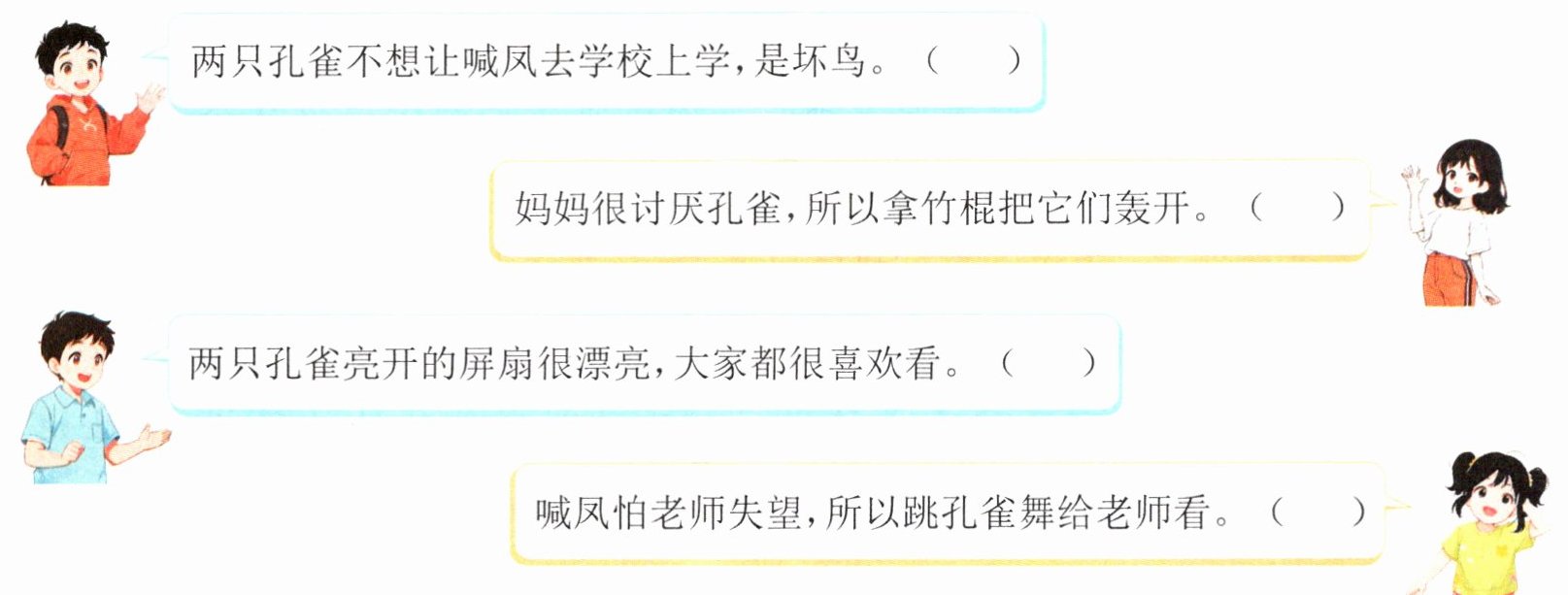 4. 第三句:√ 第四句:√ 解析:从第④自然段“两只孔雀咬住她的筒裙,不让她走”可以看出孔雀很喜欢喊凤,舍不得喊凤离开它们去上学,不能说小孔雀“是坏鸟”。从“妈妈只好拿竹棍把它们轰开”中的“只好”一词可以看出妈妈是没办法才拿竹棍轰开两只孔雀的,联系上文可知,妈妈是不想让两只孔雀影响喊凤上学,所以才把它们轰开。由第⑧自然段“它们亮开美丽的屏扇,在喊凤身边旋转、鸣叫。老师和小朋友们都拍起手来”可知,老师和小朋友们都喜欢看孔雀开屏。从第⑥自然段“喊凤只会数数,不会写名字。她怕老师失望,忙说:‘我会跳孔雀舞!’”可以知道喊凤跳孔雀舞的原因。