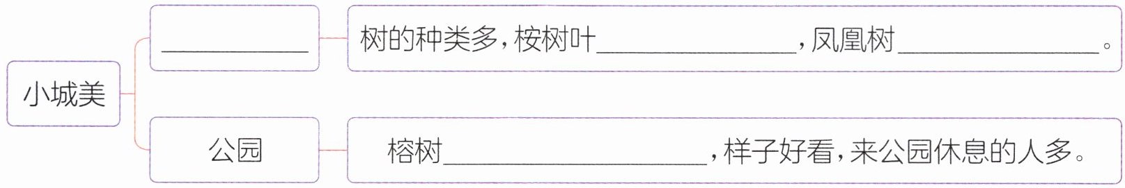 1. 小城里每一个庭院都栽了很多树。 小城的公园更美。 2. 庭院 满街满院飘香 开得热闹 数量多 3. B 解析:凤凰花是红色的,满城的凤凰花盛开时,一片片的红色,就像一片片红云。因此,“红云”指的是凤凰花。 4. ② 树叶密不透风 遮太阳,挡风雨
