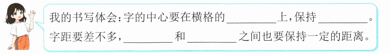我的书写体会:字的中心要在横格的______上,保持______。字距要差不多,______和______之间也要保持一定的距离。