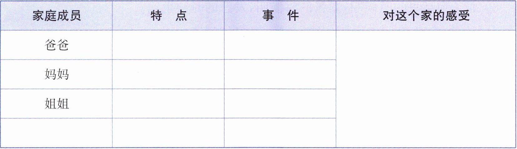 | 家庭成员 | 特 点 | 事 件 | 对这个家的感受 |