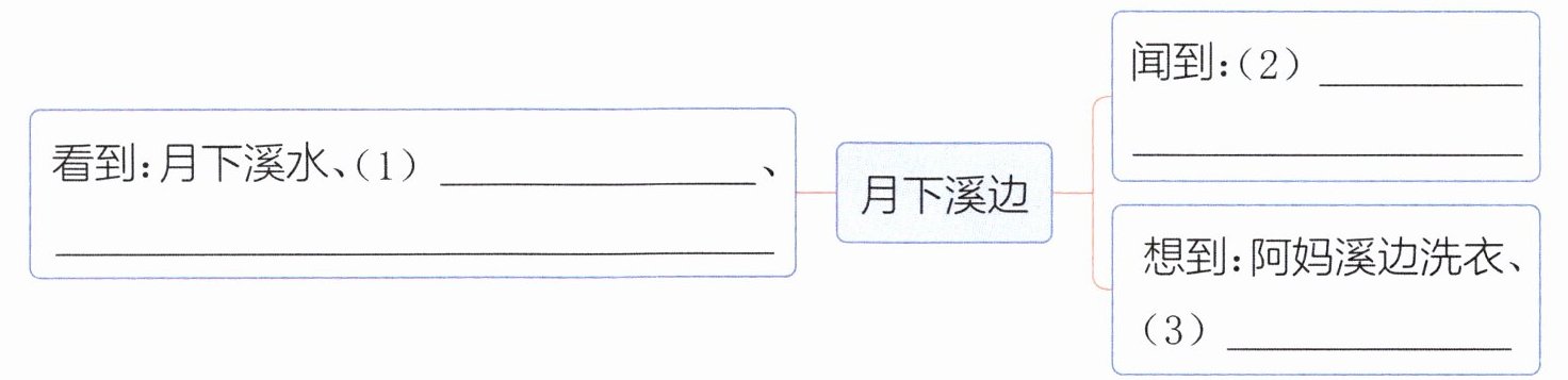 ④ 细细的溪水,流着山草和野花的香味,流着月光。灰白色的鹅卵石布满河床。哟,卵石间有多少可爱的小水塘啊,每个小水塘都抱着一个月亮! 哦,阿妈,白天你在溪里洗衣裳,而我,用树叶做小船,运载许多新鲜的花瓣……哦,阿妈,我们到溪边去吧,去看看小水塘,看看水塘里的月亮,看看我采过野花的地方。