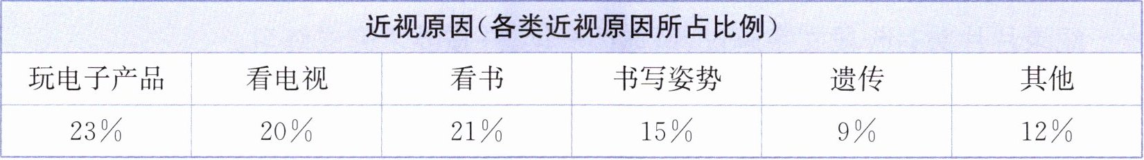 | 近视原因(各类近视原因所占比例) | | | | | |