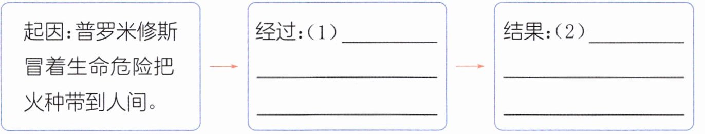 1.(1)普罗米修斯受到宙斯严厉的惩罚,但他矢志不渝,不肯屈服。(2)普罗米修斯被大力士赫拉克勒斯救下,获得了自由。 2. 示例:普罗米修斯每天都要被鹫鹰啄食肝脏。 这个情节生动地展现了普罗米修斯所遭受的极端痛苦,他在如此残酷的折磨下依然不屈服,凸显了他的坚韧和为人类牺牲的伟大精神。 3.(1)“盗”取火种 (2)不畏强暴、为民造福 (3)钻木取火 (4)聪明善思