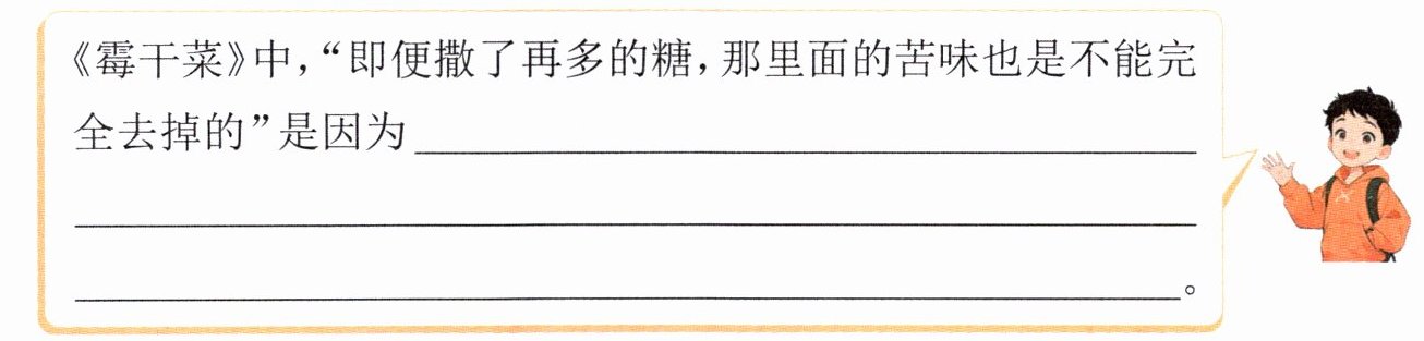 3. 作者在第①自然段细细描写了霉干菜的滋味,但结尾却说“即便撒了再多的糖,那里面的苦味也是不能完全去掉的”,这两处是否矛盾?为什么? ______ ______