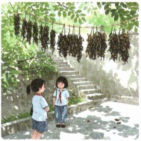 ① 那天下午,我和小容放了学正往家走,下了十几级梯坎,眼前一亮,斜坡上的两株洋槐树之间牵着根麻绳,麻绳上挂满了霉干菜。 馋嘴的我在大人做菜前,常常会讨一小段霉干菜生吃当零食,咸津津的,带一点点甜,和吃盐金枣的感觉差不多。那一刻,我被眼前绳串上的霉干菜吸引,肚子里的馋虫被勾了出来。歪过头,见小容也在盯着霉干菜看。
