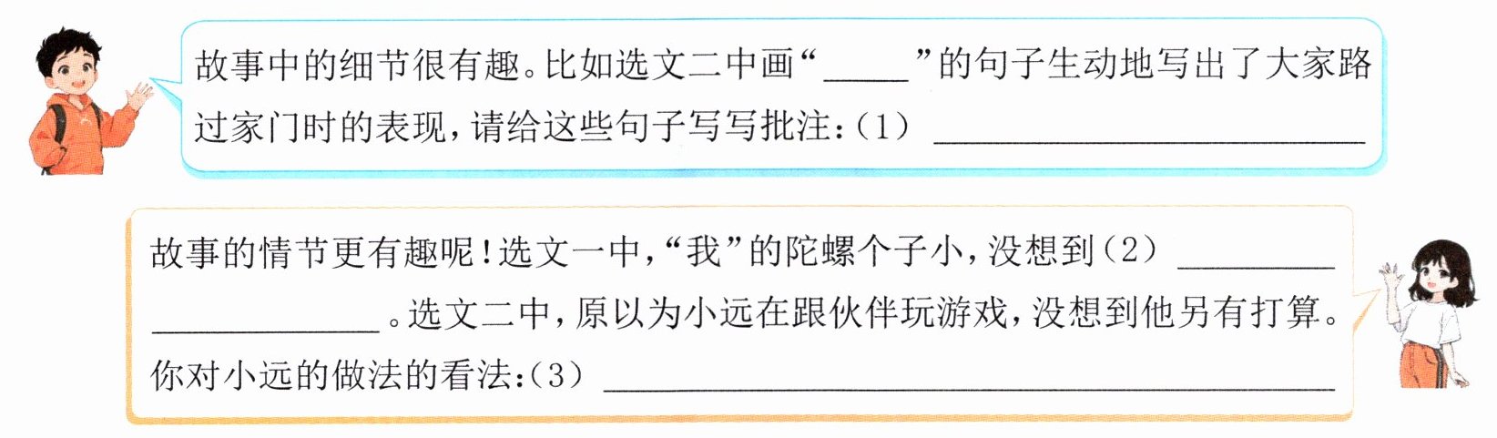 故事中的细节很有趣。比如选文二中画“____”的句子生动地写出了大家路过家门时的表现,请给这些句子写写批注:(1)______