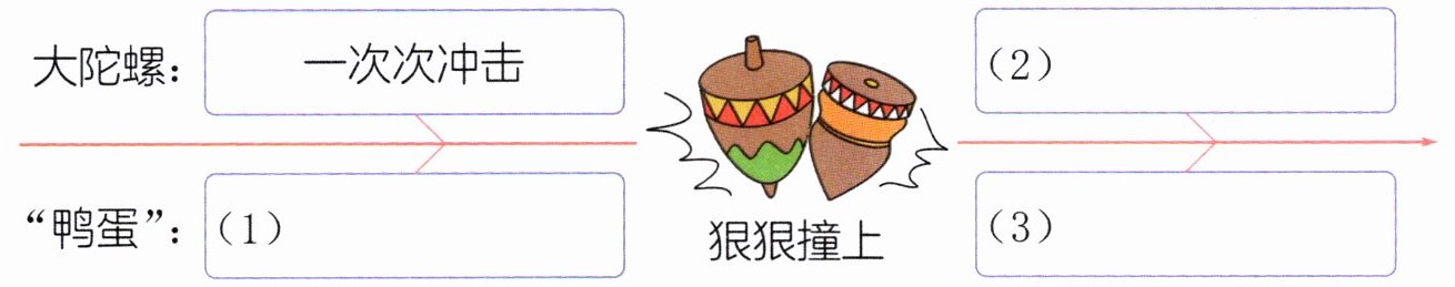 ② 奇怪的是,我的陀螺个头小,却顽强得出奇!明明被撞翻在一边,一扭身又照样旋转起来。它圆头圆脑,好像上下左右都能找到支撑点似的。结果呢,大陀螺在这个始终立于不败之地的对手面前,彻底溃败了。