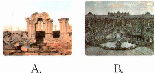 A图对应"百年成毁何匆促,四海荒残如在目"。在A图中我们看到的只有残垣断壁,一片荒凉。这两句描述了圆明园被毁后的荒凉,让人无比痛惜。B图对应"谁道江南风景佳,移天缩地在君怀"。B图展示的是圆明园昔日的辉煌。这两句正是对圆明园吸纳江南园林风情,集南北园林艺术之大成的赞美。