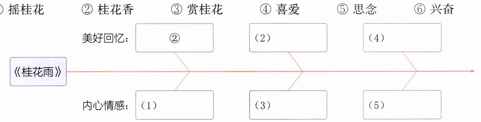 1. 片段中描写了摇桂花的场景,根据提示将“我”的心情变化补充完整。