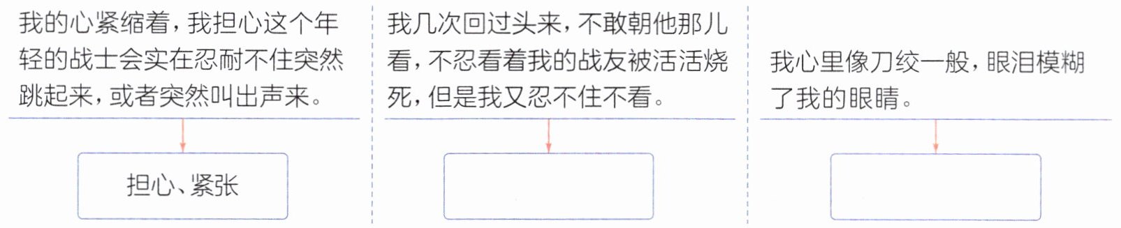 三、读相关语句,体会“我”看见战友被大火吞噬时的复杂心情。