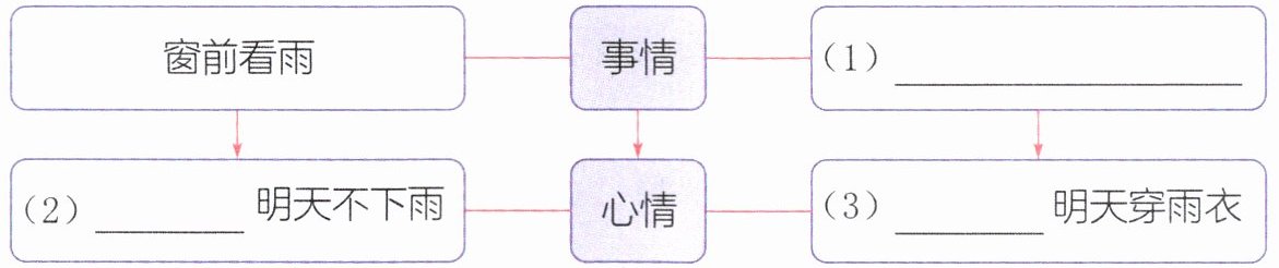 1.(1)雨后看景 (2)担心 (3)盼望 2. 比喻 盼 3.(1)雨前 (2)雨中 (3)雨后 (4)小时候,最爱看下雨,韵味十足的雨会让人有了诗情。 4. B 解析:雨来临时,人们不得不停止手中的事情去避雨,并没有厌烦。 5.(1)想要穿新雨衣到外面去。 (2)雨韵味十足,让人有诗情,还可以洗去城市的尘埃与污秽。