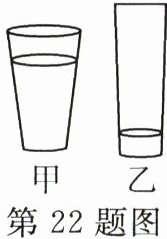 22. 如图是生活中常见的两种玻璃水杯,它们的底面积相同,将它们放在水平的桌面上。甲杯中盛有水,水对甲杯底的压力、压强分别为$F_1、$$p_1;$现将甲杯中的水全部倒入乙杯中(未溢出),水对乙杯底的压力、压强分别为$F_2、$$p_2。$请判断$:F_1______F_2,p_1______p_2。$(均填“>”“<”或“=”)