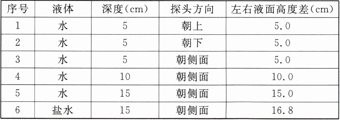 |序号|液体|深度(cm)|探头方向|左右液面高度差(cm)|