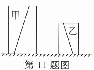 11. 如图所示,小晨将甲、乙两个实心均匀正方体分别放在水平地面上,测得它们对地面的压强相等,则甲乙两正方体的密度$\rho_{甲}$______$\rho_{乙}$。接着小晨将两个正方体沿图示的方向截去一部分,都拿走右半部分,则甲、乙剩余部分对水平地面的压强$p_{甲}$______$p_{乙}$。(均填“>”“<”或“=”)