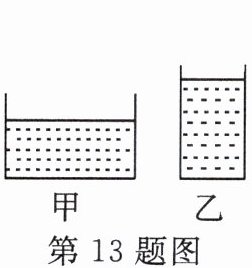 13. 如图所示,甲、乙两个容器中水的质量相同,两个容器底部受到水的压力大小关系是$F_{甲}$______$F_{乙}$;两个容器底部受到水的压强大小关系是$p_{甲}$______$p_{乙}$。(均填“>”“<”或“=”)