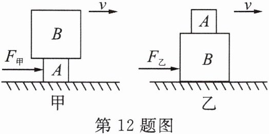 12. 如图所示,实心正方体$A$、$B$的材质与表面粗糙程度相同,且$m_{A}:m_{B}= 1:8$,$A$、$B$叠放于水平地面,在水平推力$F$的作用下一起向右做匀速直线运动,甲、乙两种情况对地面的压强$p_{甲}:p_{乙}= $______,水平推力$F_{甲}:F_{乙}= $______。