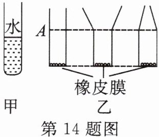实验器材(如图乙):上端开口形状不同的玻璃容器3个(虚线$A$以下完全相同),橡皮膜,刻度尺,水。