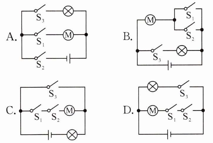 $C. S_3 $串联$ S_1 S_2 M $并联 灯泡 电源