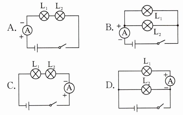 5. 下列电路中测灯$L_1$的电流,正确的是 ( )