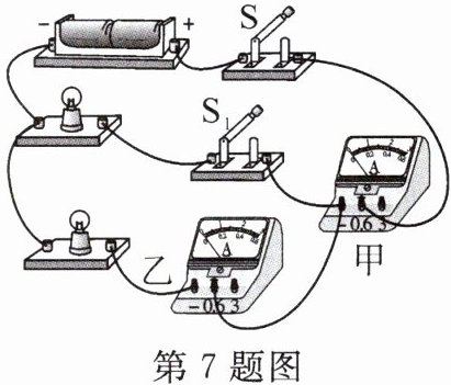 7. 如图是研究并联电路电流特点的实物图,电源电压保持不变,先同时闭合开关S和$S_1,$两灯均发光,观察并记录电流表示数后,断开开关$S_1,$此时 ………………………………………( )