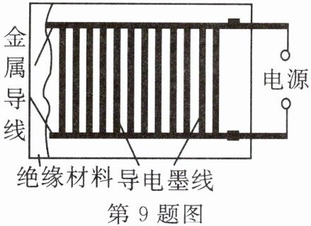 9. 电热膜是一种新型电热器件,经过特殊工艺加工形成的导电墨线两端与金属导线相连,其内部结构如图所示。由图可知,组成电热膜电路的导电墨线的连接方式是______联,导电墨线在电路中相当于______(填“导线”或“用电器”)。