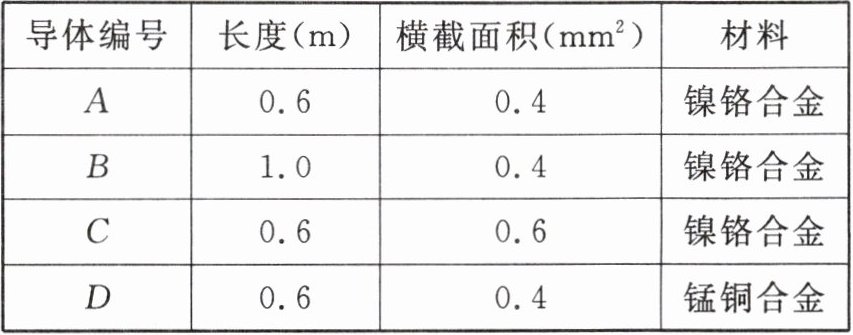 (3)接下来,他分别将A和C两导体接入电路进行实验,发现对应电路中的电流$I_A < I_C$,这表明在______相同时,导体的______越小,导体的电阻越大。