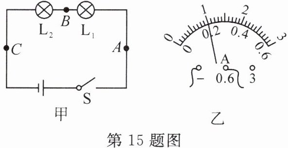 15. (6分)如图甲所示的串联电路中,闭合开关S时,小桂发现灯泡$L_1$比$L_2$更亮,他猜想可能有以下原因: