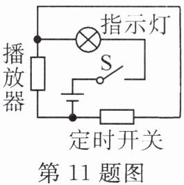 11. 如图所示,是一种课间音乐定时播放装置的原理图。“定时开关”是到达设定时间会自动断开的开关。闭合开关S,未到达设定时间时,播放器处于______状态;到达设定时间时,指示灯______(填“会”或“不会”)发光。