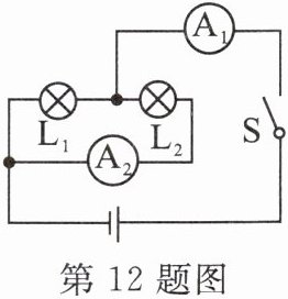 12. 如图所示电路,闭合开关S后,两个灯泡都能发光,电流表$A_1$的示数为0.5安,电流表$A_2$的示数为0.3安。灯泡$L_1$和$L_2$的连接方式为______,通过灯$L_1$的电流为______安。