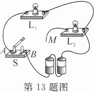 13. 如图所示,某同学要连接由$L_1$和$L_2$组成的并联电路。若开关S要同时控制两盏灯,应将导线M端接到图中______点;若开关S只控制$L_1,$则导线的M端应该接到图中的______点。(均填“A”或“B”)